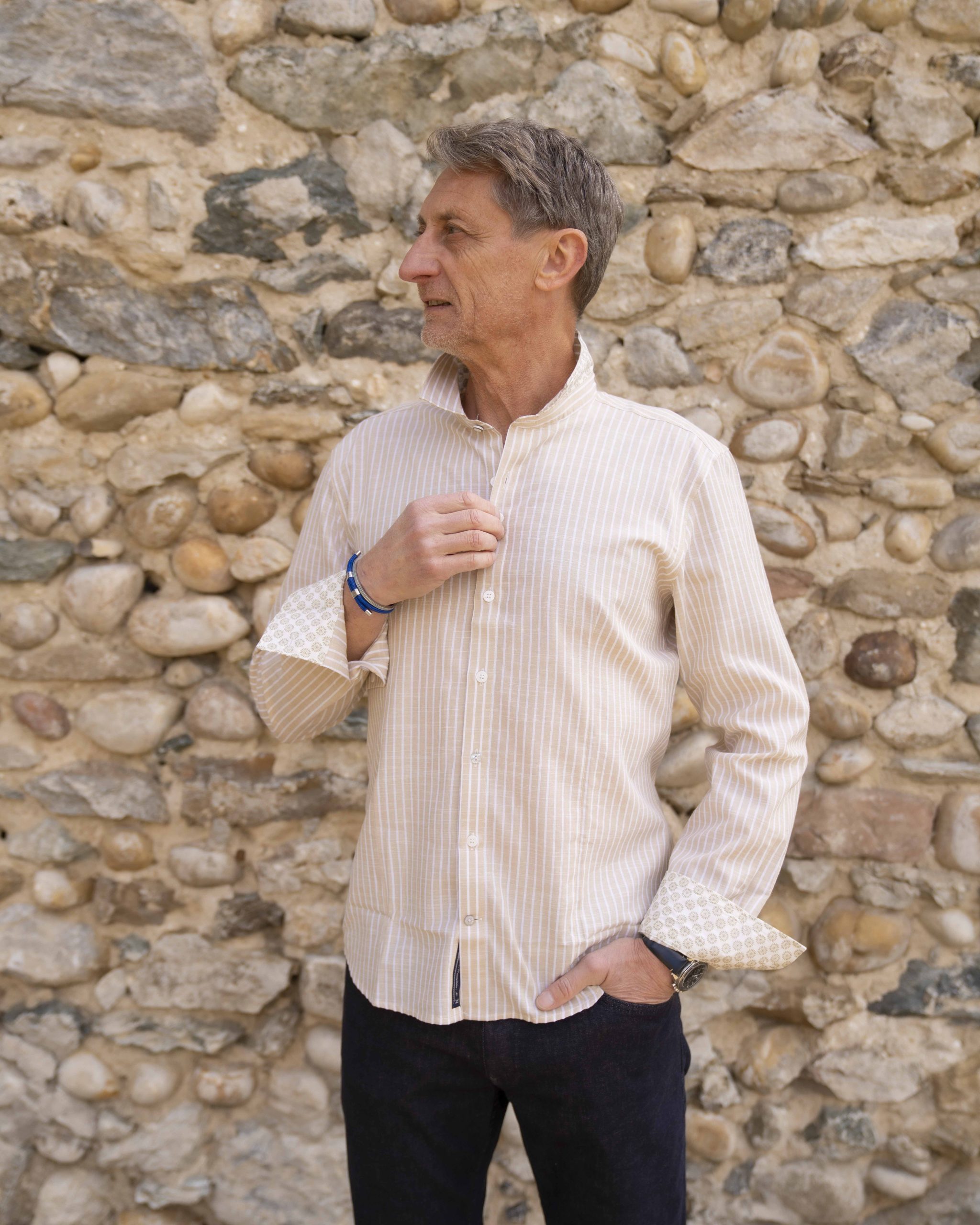 Craquez pour cette chemise « RAPHAEL » de la marque française NUMEROLOG1E ! On adore ses rayures blanches sur fond beige, qui
