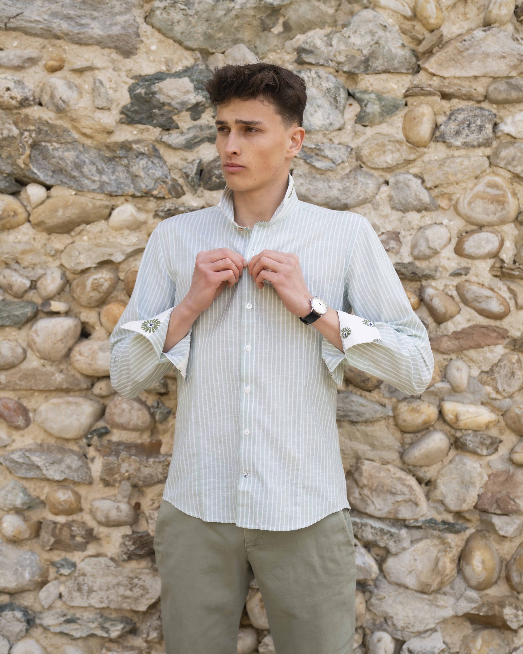Craquez pour cette chemise « RAPHAEL » de la marque française NUMEROLOG1E ! On adore ces rayures blanches sur fond vert , qui