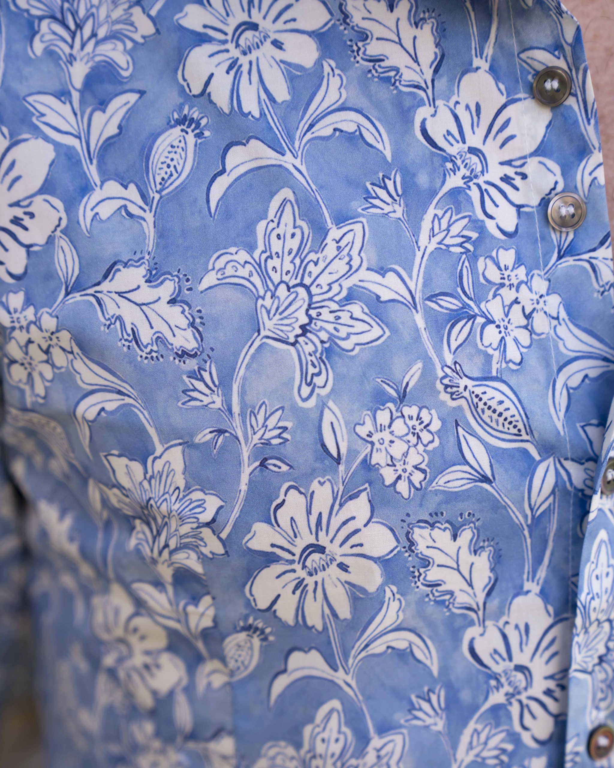 On adore son imprimée fleurie blanc sur fond bleu, qui a beaucoup d’élégance !