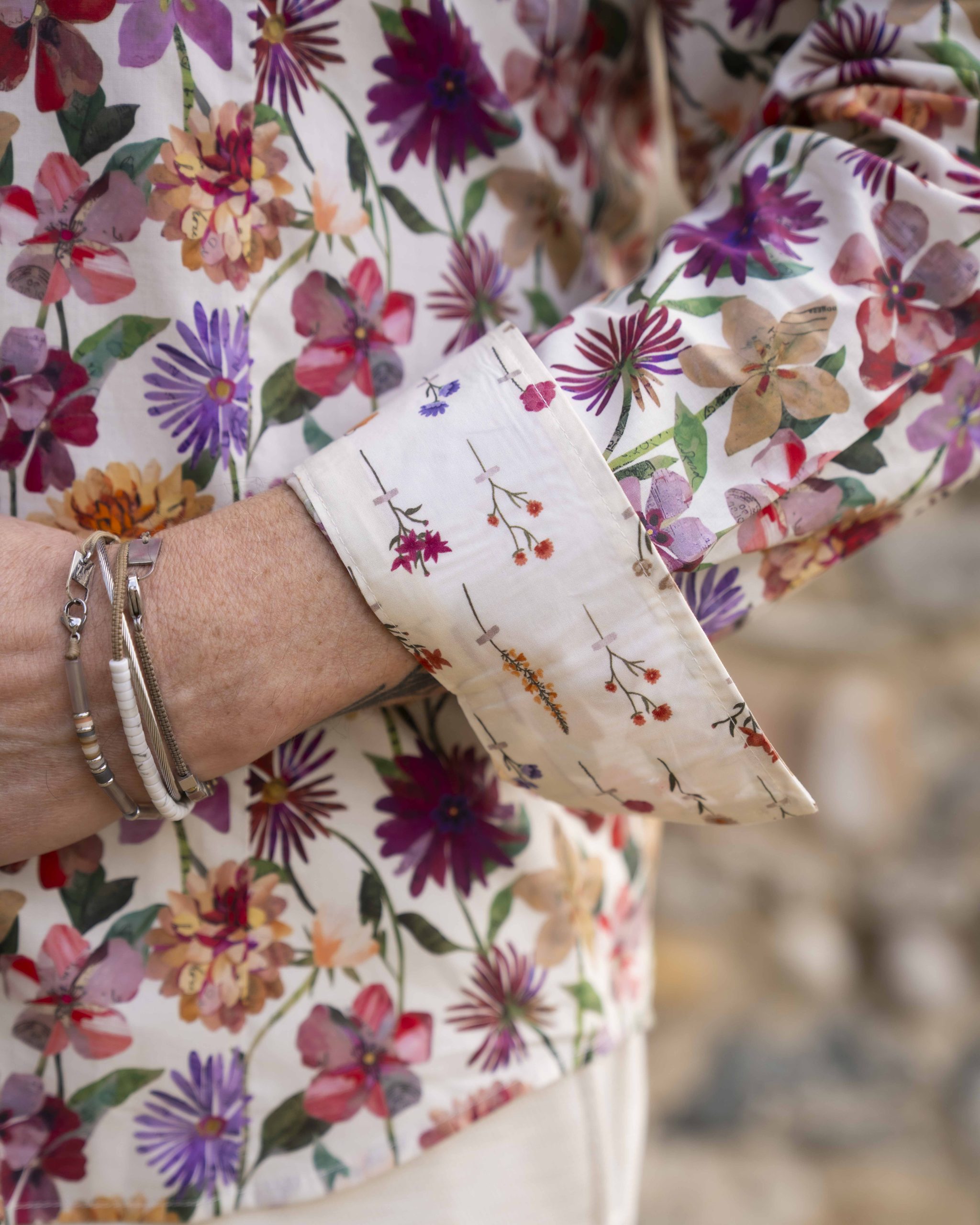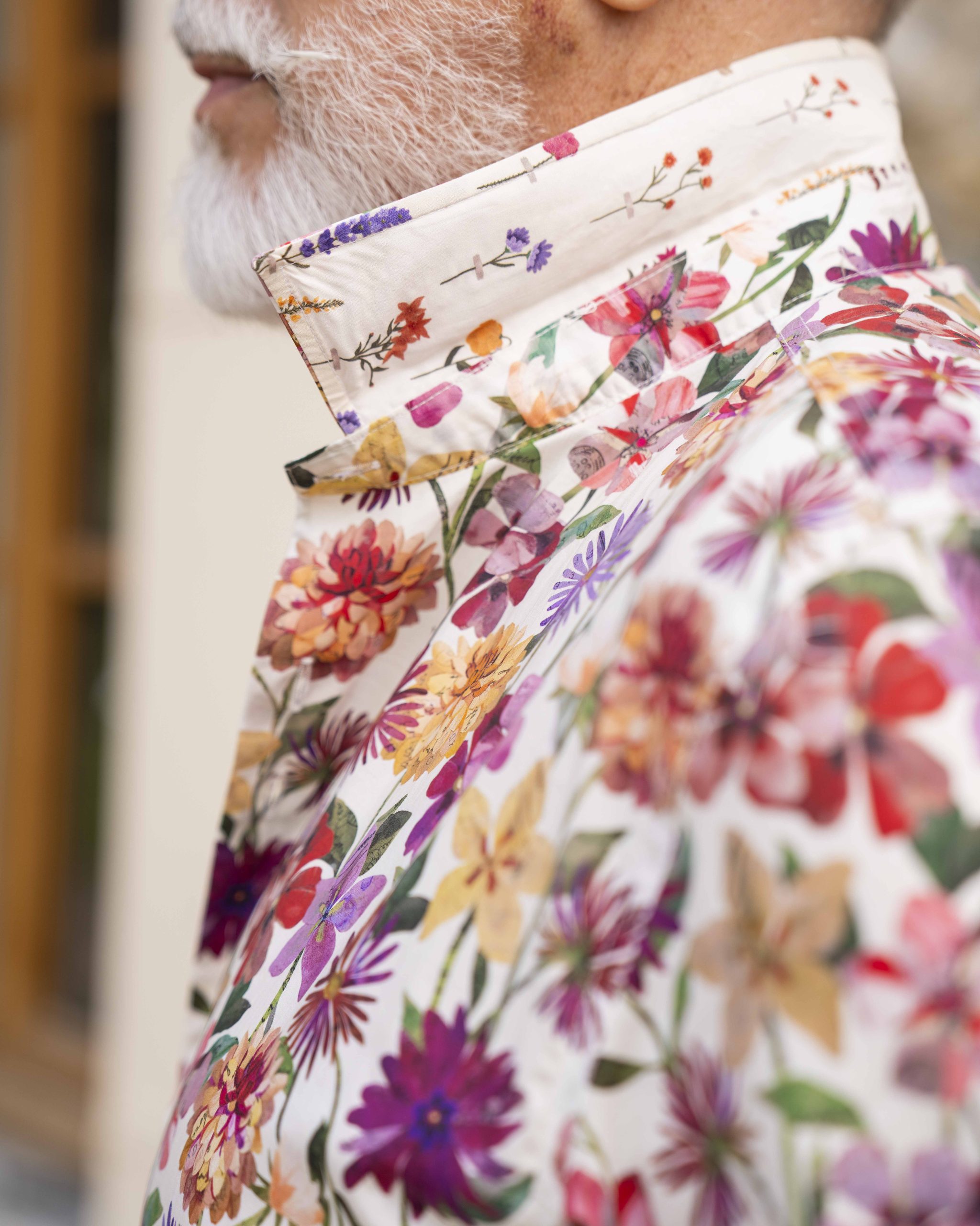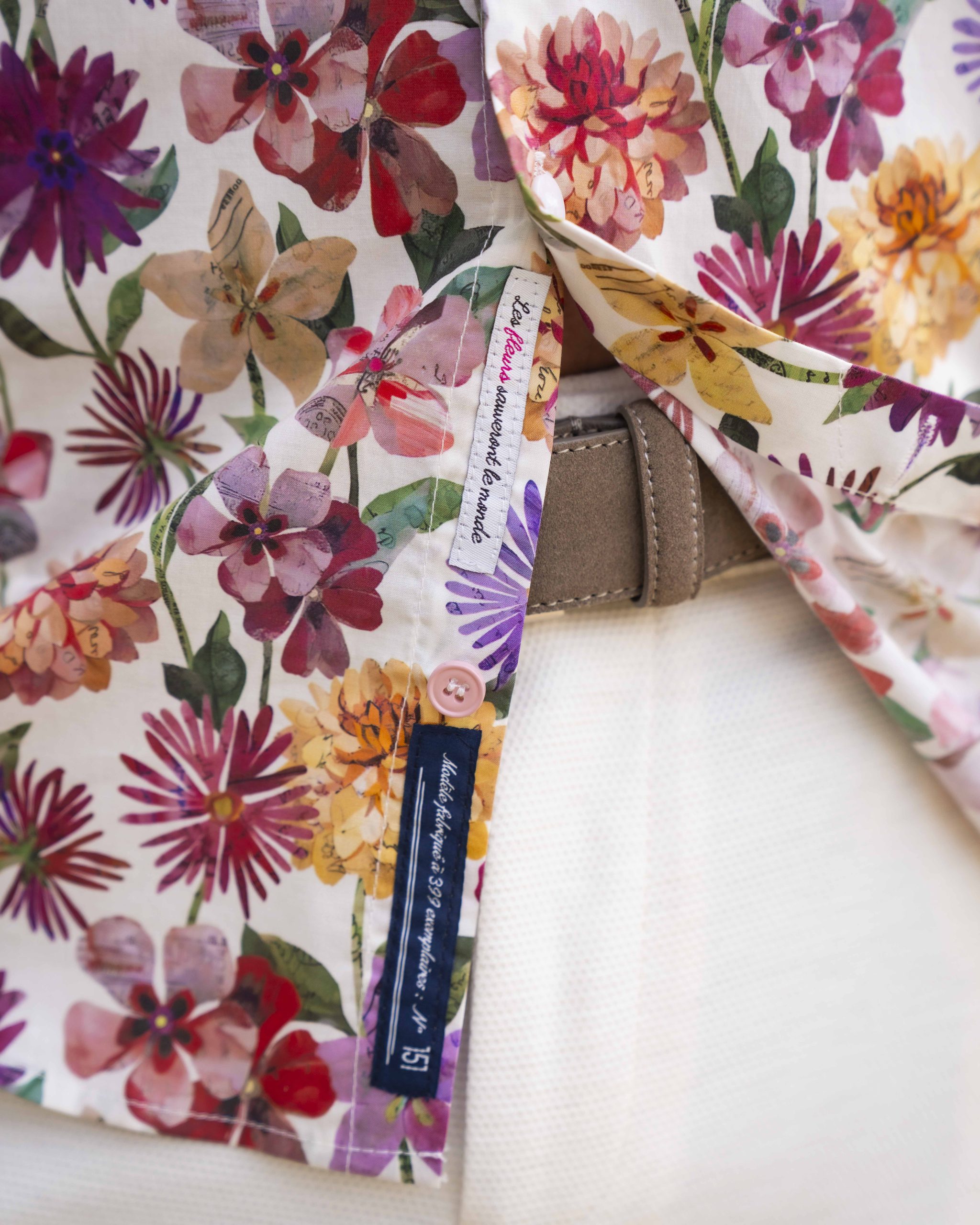 – Un autre imprimé fleurie à divers endroits sur la chemise (revers de poignets, revers et intérieur de col)